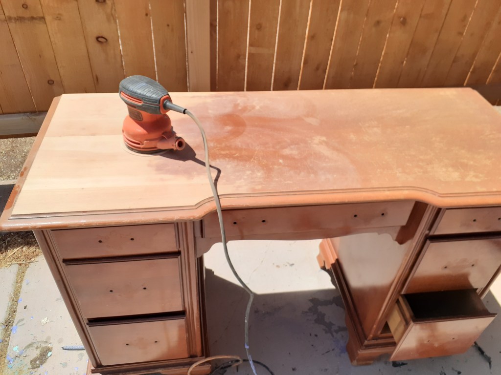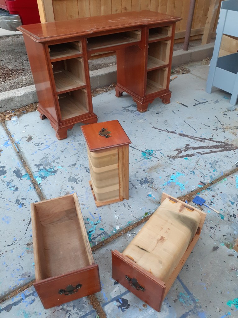 I love this beautiful desk and fun chair!I started with this desk. It’s pretty beat up and dated. I decided to give it a bright modern makeover!I got a fun surprise when I opened it up! Check out these cool drawers! They are made from one piece of wood that has been bent into shape. I’ve never seen anything like it!Starting to sand it down. This is my least favorite part of a project.