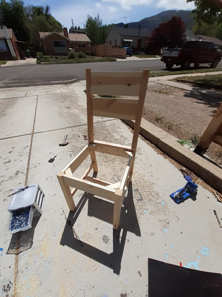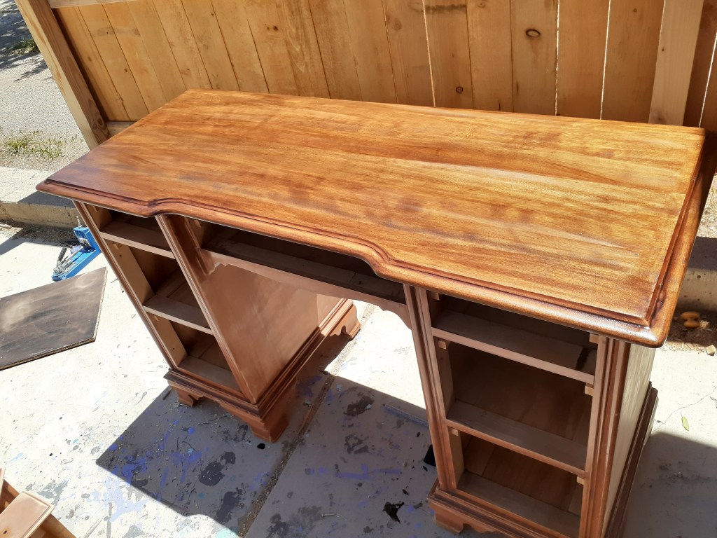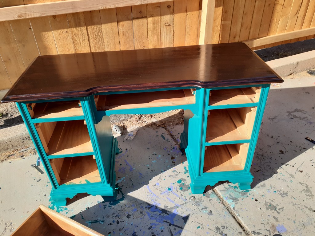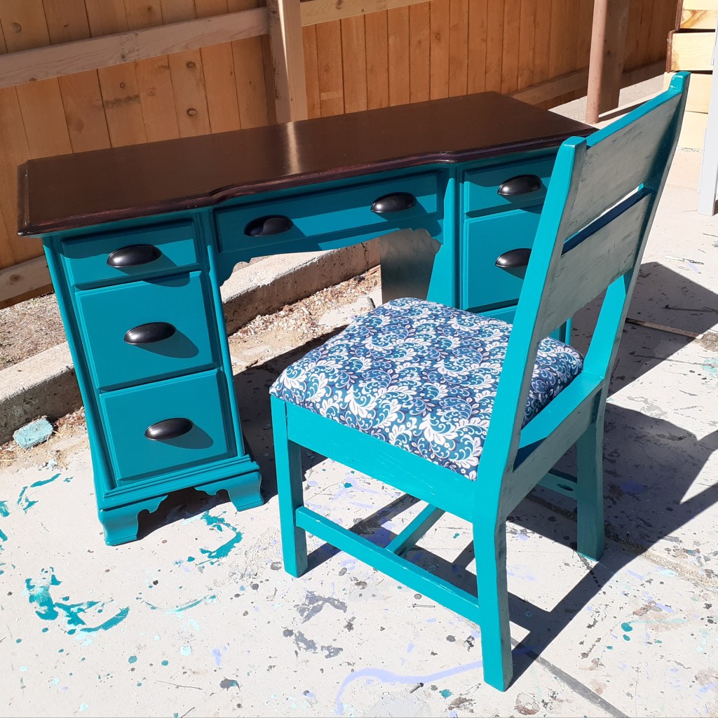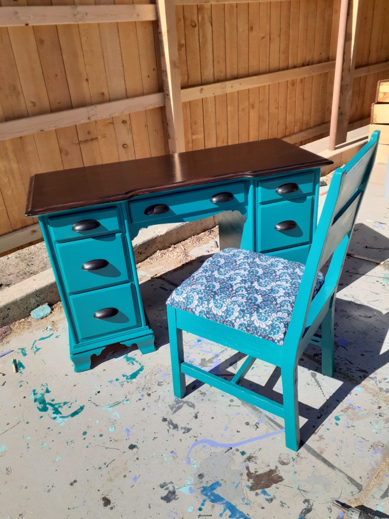 the top is all sanded and ready for new stain!So. Much. Sanding.My first layer of stain. I actually used Minwax Polyshades in espresso. Its stain and polyurethane in one product. It doesn’t give as much control as using stain and polyurethane separately, by I still like it for some projects. The more coats you apply, the deeper the color gets and it adds protection at the same time.First coat of paint on the drawers. I decided to paint the drawer face but leave the beautiful workmanship on the drawers exposed.My first coat of paint on the desk. The better you sand a project, the easier it is to paint and the better the paint adhesion. But as I may have mentioned, I really hate sanding. So it takes a couple of coats of paint to get it looking good. I also applied my second coat of stain. My third coat of espresso polyshades. I love! A rich beautiful brown that can stand up to daily use. I also finished the second coat of paint and it’s looking good!The desk is done! I used new drawer pulls to give it a more modern feel and it turned out great!For the chair, I followed Ana White’s plan, classic chairs made simple. Cutting the back legs was tricky, requiring several cuts with the circular saw and jigsaw, but as long as you take it slow and follow her instructions, it’s not too bad. It gives the chair a nice comfortable angle. I did make the chair a little smaller than her plans so it would fit inside the desk opening.I got the chair all painted. It’s the same color as the desk. I’m in love with this color! Its Behr Caribbean Current from home depot. A beautiful rich teal.Here’s my finished chair!I think this fun little desk and matching chair turned out great!