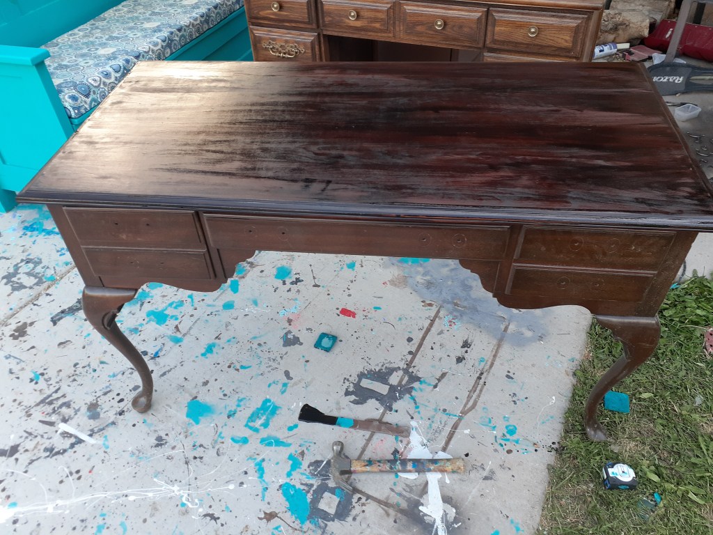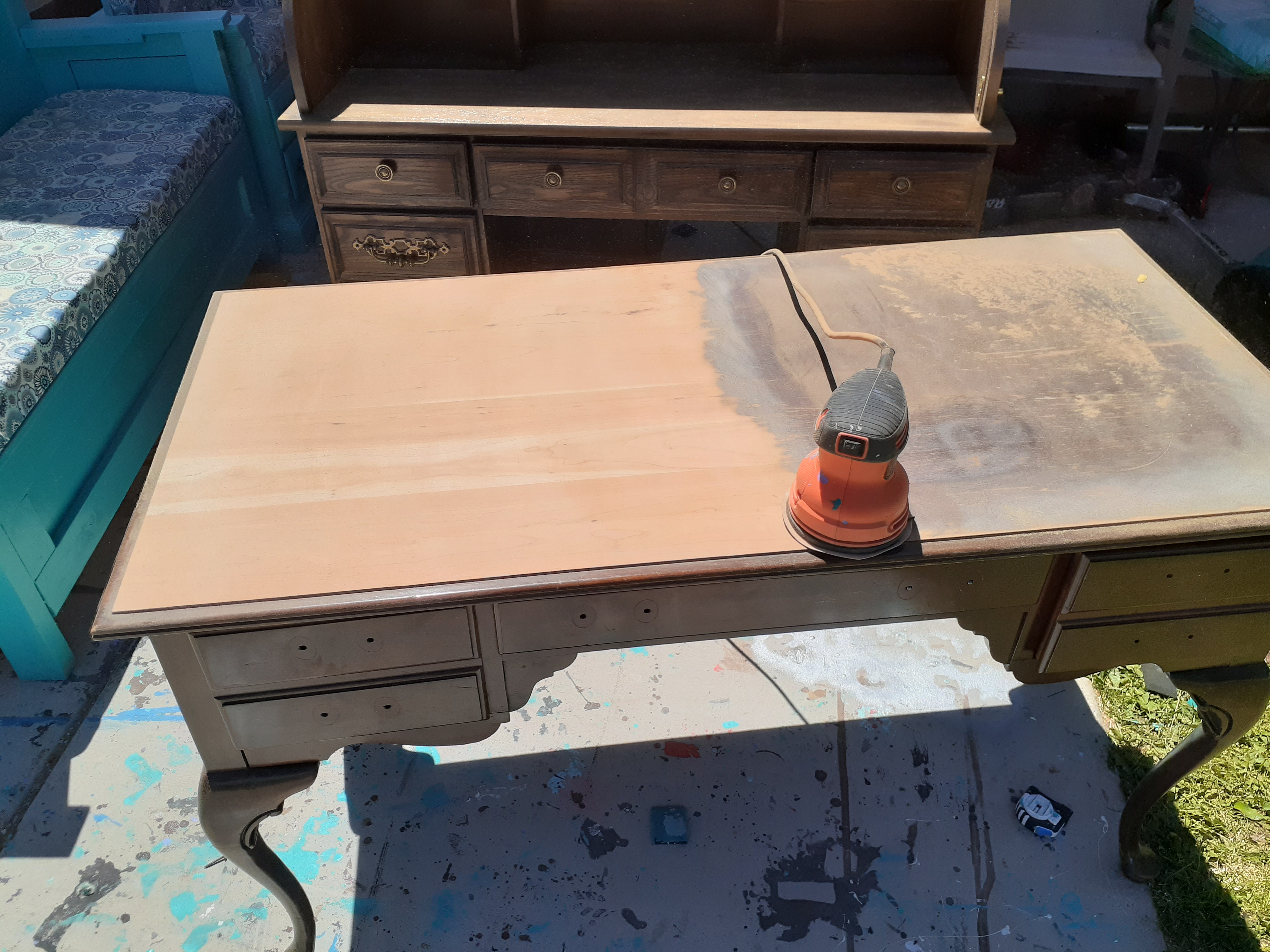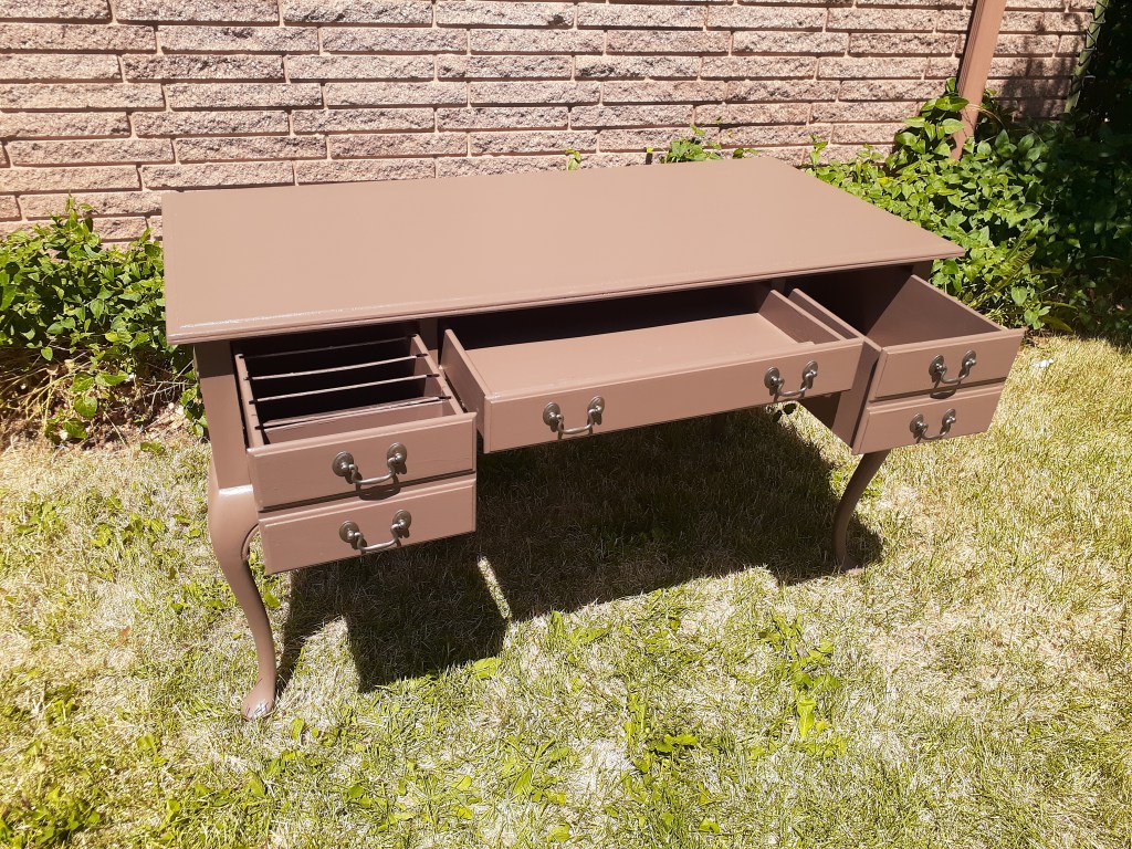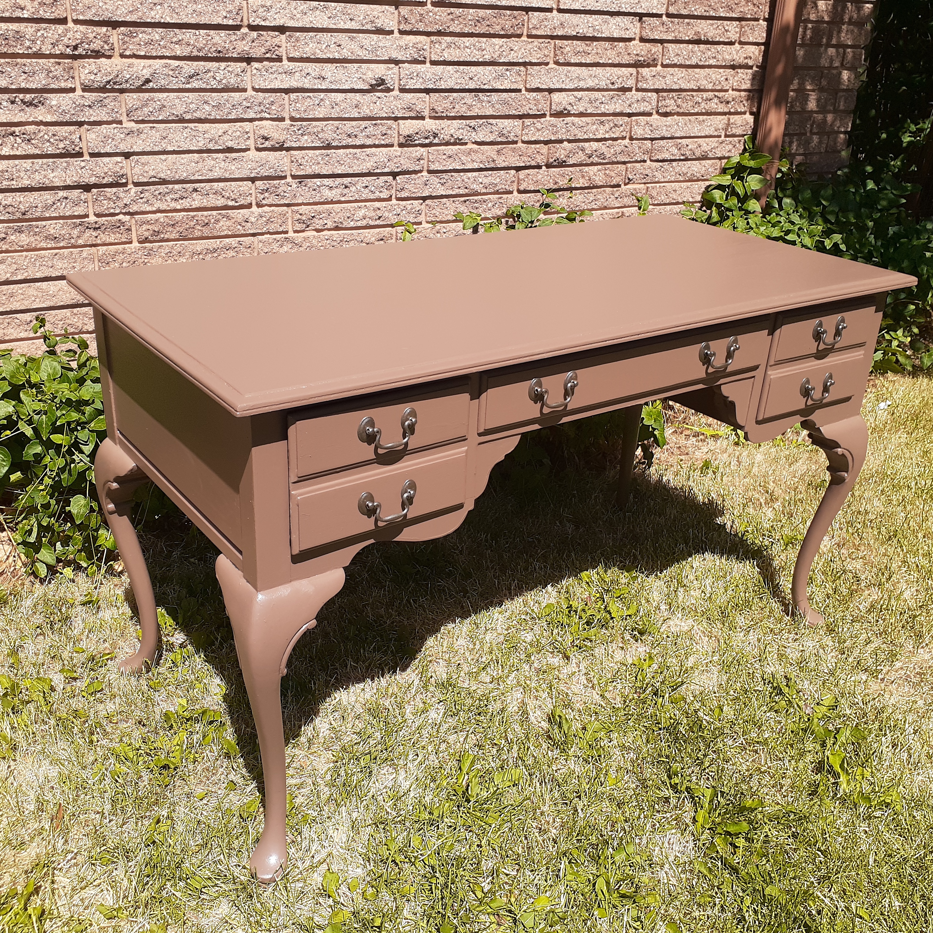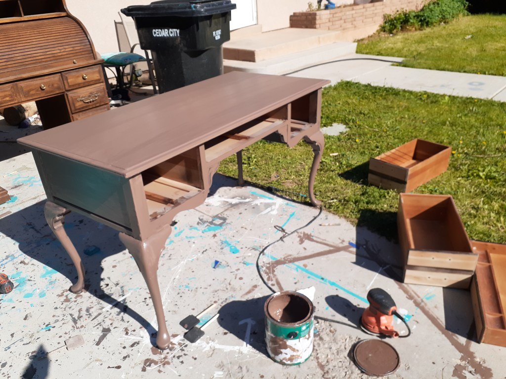 This desk was a quick little projectI bought it thinking it was a five drawer vanity. My original plan was to add a mirror and a fun little stool.But unfortunately, it was only 3 drawers and one of them had a divider so I decided to just leave it as a desk.So I started sanding.And sandingAnd sanding. So. Much. Sanding.It was beautiful cherry wood!I tried using minwax Polyshades in espresso. Rather than giving it the rich brown I was hoping for, it went almost black and it was pretty blotchy. I checked it again in twelve hours and it’s still didn’t cure. It was still super sticky and I was not happy with it at all.So I used sandpaper and steel wool to remove the finish. I still couldn’t get it completely clean again, so in the end, I decided to paint the whole thing. I sanded down the rest of the desk and the drawers.My first coat of paint! This color of brown took three coats which was kind of a pain. I expect better coverage from Behr Premium Plus.I normally choose cool colors or bright fun shades so this brown was a little outside my comfort zone but I still think it turned out pretty nice! A few coats of Minwax Polycrylic to protect the top and it’s done!After looking at it for a few weeks, I decided to try again. I sanded the top down to bare wood and refinished it with Minwax Polyshades in Espresso. I also repainted the body in Perfect Taupe and I love the transformation!