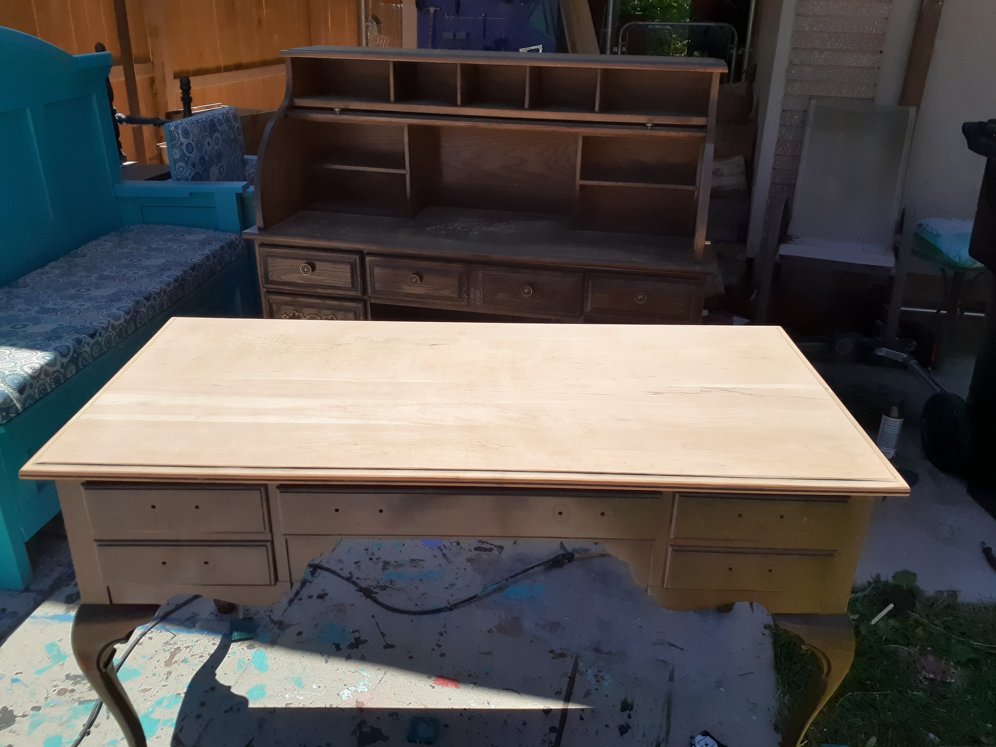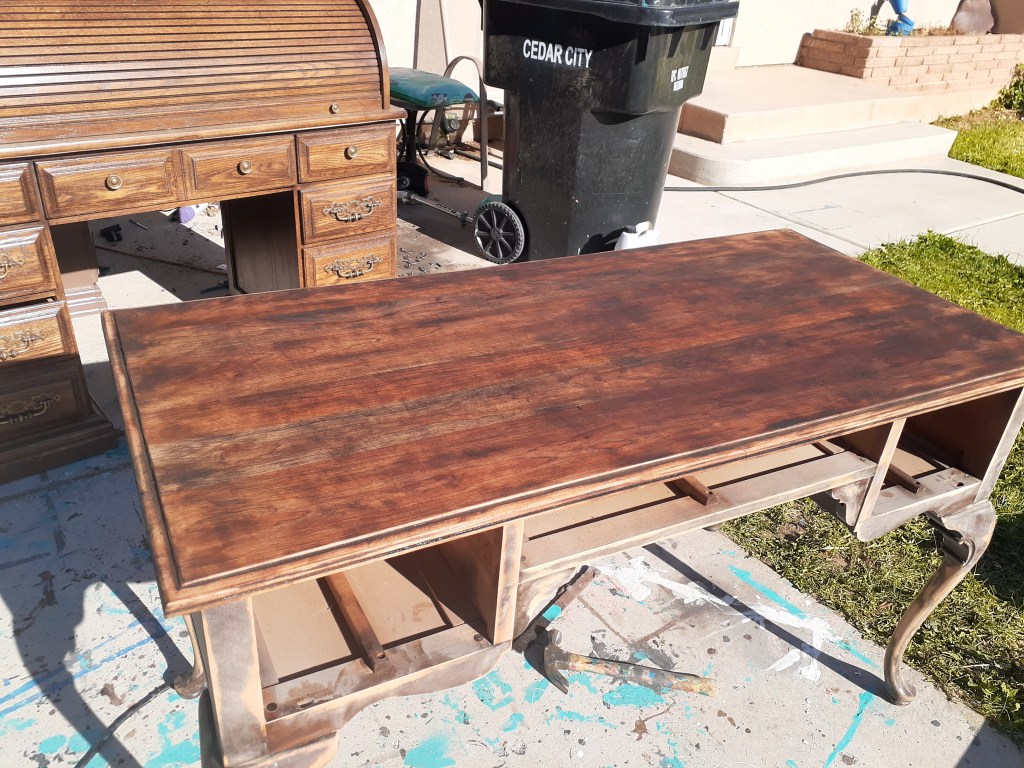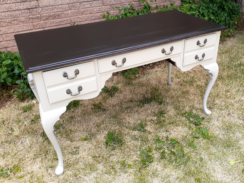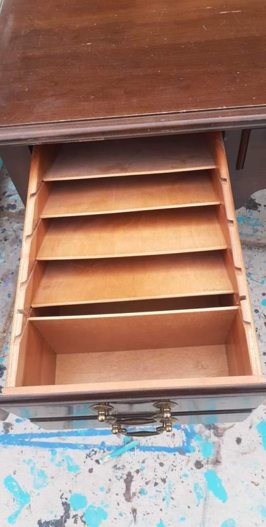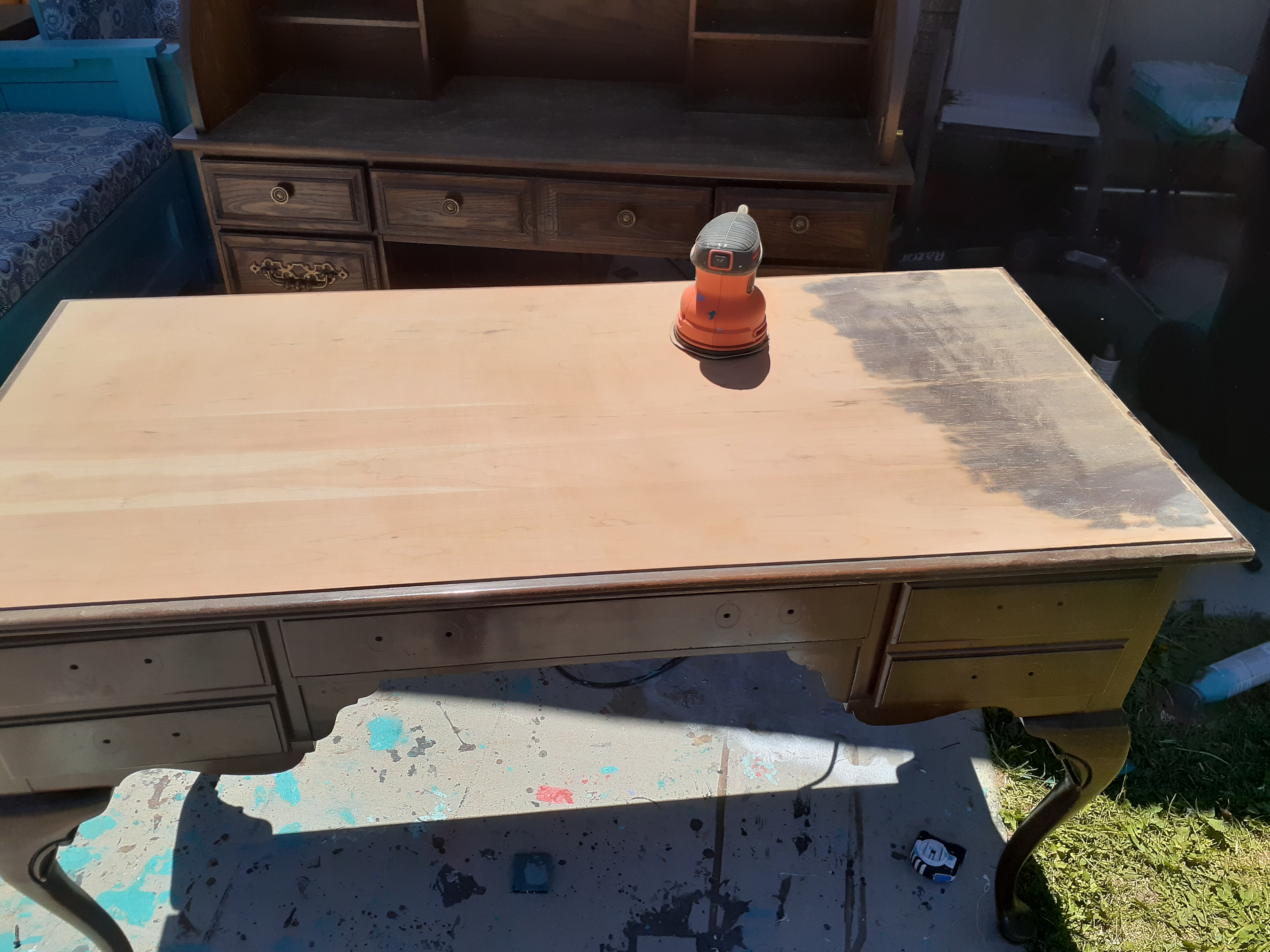 This desk was a quick little projectI bought it thinking it was a five drawer vanity. My original plan was to add a mirror and a fun little stool.But unfortunately, it was only 3 drawers and one of them had a divider so I decided to just leave it as a desk.So I started sanding.And sandingAnd sanding. So. Much. Sanding.It was beautiful cherry wood!I tried using minwax Polyshades in espresso. Rather than giving it the rich brown I was hoping for, it went almost black and it was pretty blotchy. I checked it again in twelve hours and it’s still didn’t cure. It was still super sticky and I was not happy with it at all.So I used sandpaper and steel wool to remove the finish. I still couldn’t get it completely clean again, so in the end, I decided to paint the whole thing. I sanded down the rest of the desk and the drawers.My first coat of paint! This color of brown took three coats which was kind of a pain. I expect better coverage from Behr Premium Plus.I normally choose cool colors or bright fun shades so this brown was a little outside my comfort zone but I still think it turned out pretty nice! A few coats of Minwax Polycrylic to protect the top and it’s done!After looking at it for a few weeks, I decided to try again. I sanded the top down to bare wood and refinished it with Minwax Polyshades in Espresso. I also repainted the body in Perfect Taupe and I love the transformation!