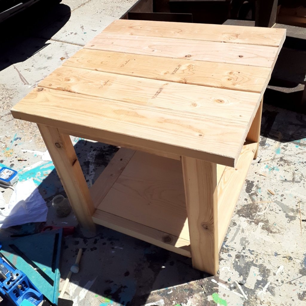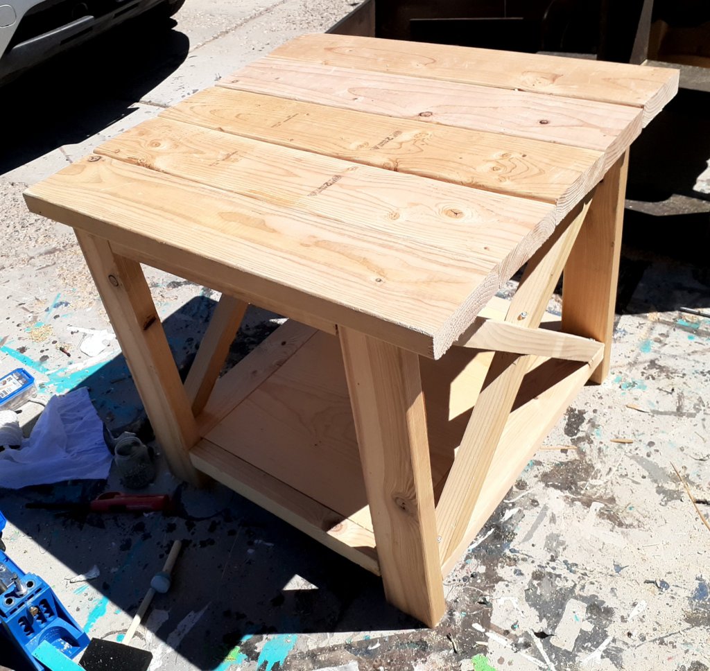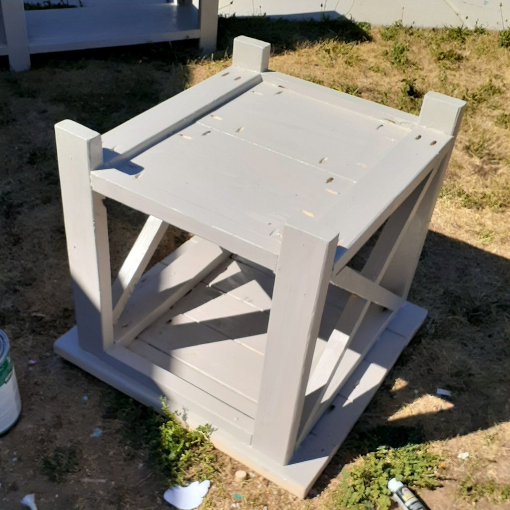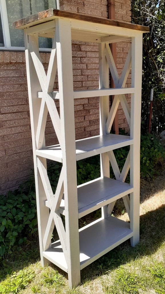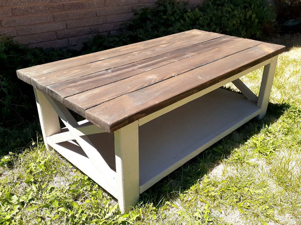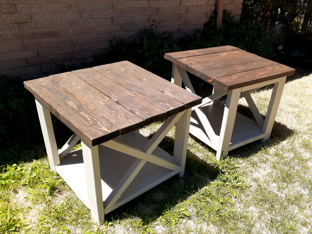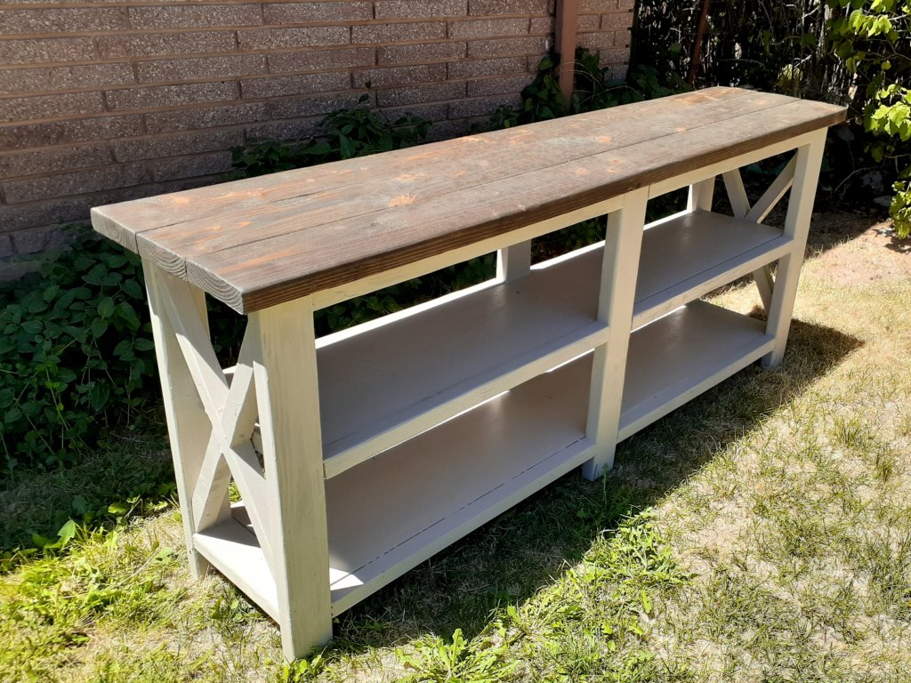I didn’t take many progress photos but for all 4 pieces, you make 2 matching frames and then attach side pieces.Make sure you cut your boards carefully, ensuring they are exactly the right size and perfectly straight so everything will fit together!For the tabletop, I connected all the boards together from the bottom using pockethole screws and joinery.Because it’s made from 2x4s and 2x6s which are pretty rough, a lot of sanding is required to get a nice finish!I attached my X’s using glue and screws but nails would have given it a cleaner look. The X’s are a pain in the butt trying to get all the angles just right so they will fit together perfectly! I paint the underside first to make life easier. This way I dont have to worry about messing up the finished top. I used Behrs Perfect taupe. I stained the top using Minwax stain in Espresso. This is my favorite color of stain. It gives a deep, rich, chocolatey brown. It’s easy to apply. Wipe on with one rag, let it sit for a few minutes, wipe off with a clean rag, and then protect it a few hours later using Polycrylic brushed over the top in thin layers.I made 2 of the side tables. These things are huge! If I was doing it over again, I would have used 1x10s for the center panel instead of 1x12s and used 4 2x6s for the top instead of 5.For the bookcase, I made it narrower so I only had to buy 1 1×12 board. I wish I had made it taller. It’s only 70 inches tall. As you can see, my X’s didn’t turn out perfectly here.I love this coffee table! It’s a great size and very sturdy!The console table turned out beautifully! Overall, I had a lot of fun making this set! It’s very sturdy and well built.