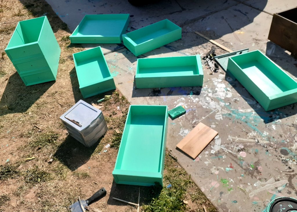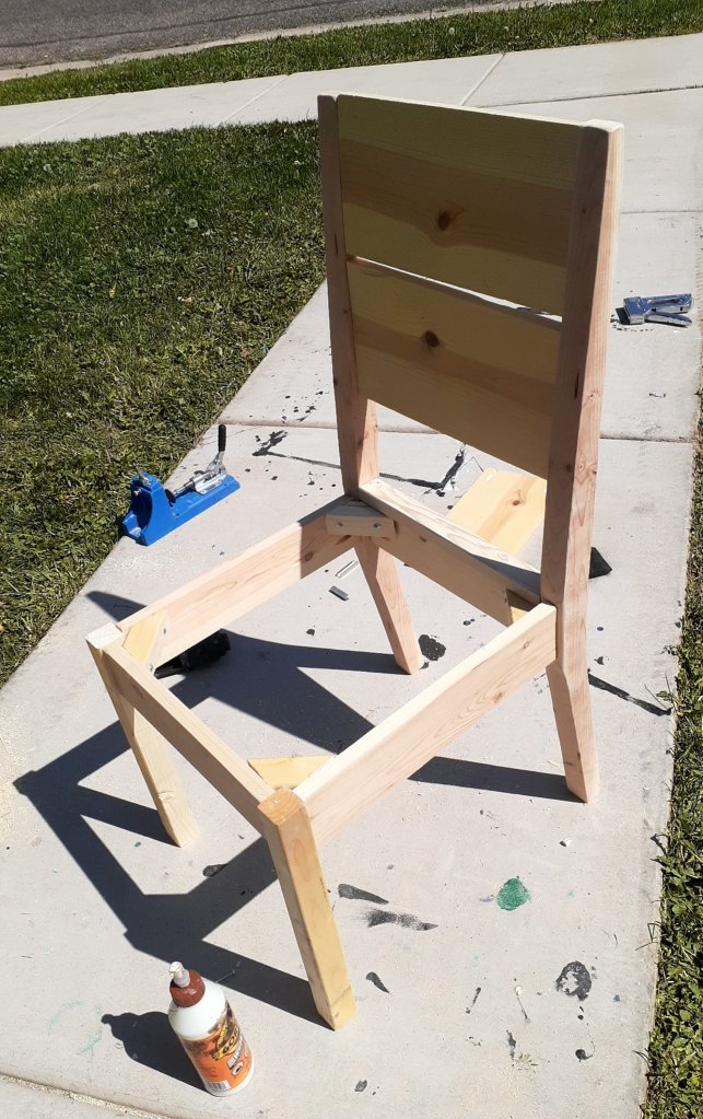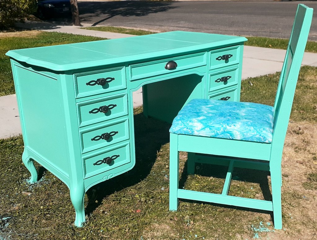I transformed this beat up old desk and built a matching chair!The structure of the original desk wasn’t bad. It was missing a knob and the original finish was damaged in several places.I removed the drawers and knobs and sanded it all down.I painted it with Behr green parakeet. It took 3 coats. I painted the insides, fronts and sides of the drawers but left the backs and bottoms plain.I reattached the knobs and used a drawer pull on the center to replace the missing handle. I also added a few coats of polycrylic to the desktop to protect the finish and make it more durable.For the chair, I used Ana White’s plan for Classic Chair Made Simple. However, the original plans make a fairly large chair and it would have been too big to fit with the desk so I made the seat an inch shorter and made it 2 inches smaller in length and width.I wouldn’t recommend this chair for a beginner project. The back legs involve several angled cuts that have to be exact an everything has to match up perfectly so your chair doesnt wobble. If you take it step by step and measure carefully, it’s a nice chair.I painted the chair first before adding the cushion. The cushion matches much better in person than it does in the photo.I love how it turned out! It’s not as bright in person as it appears in the photos but it’s a beautiful color and will be super fun as a homework desk!
