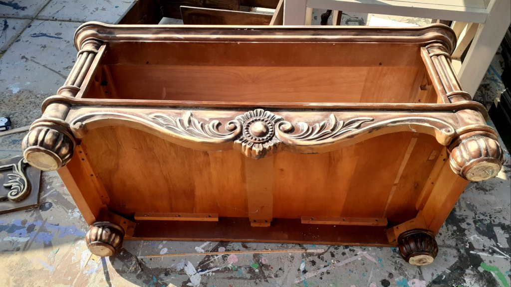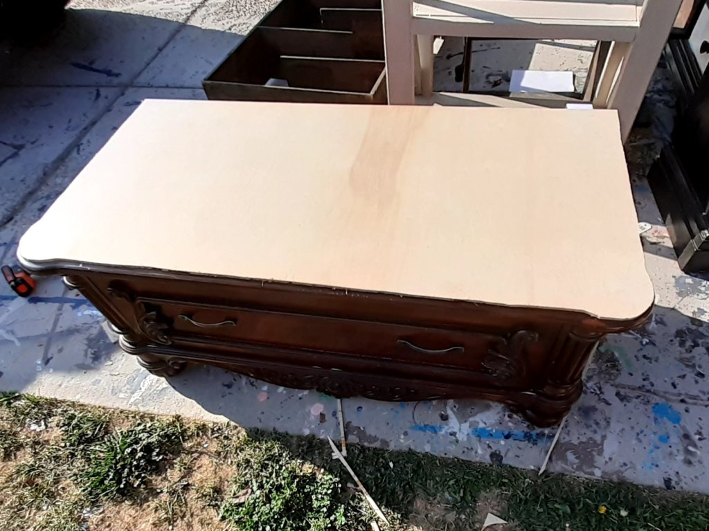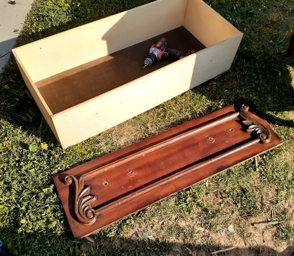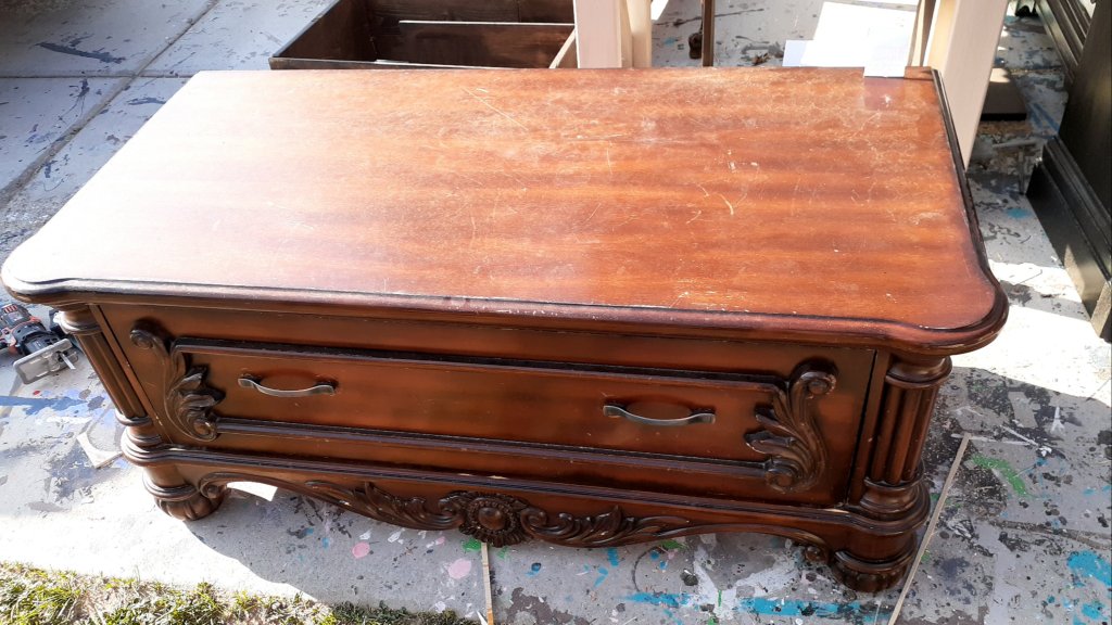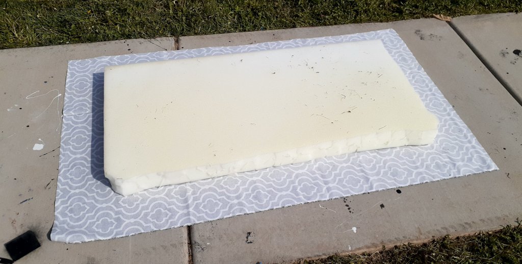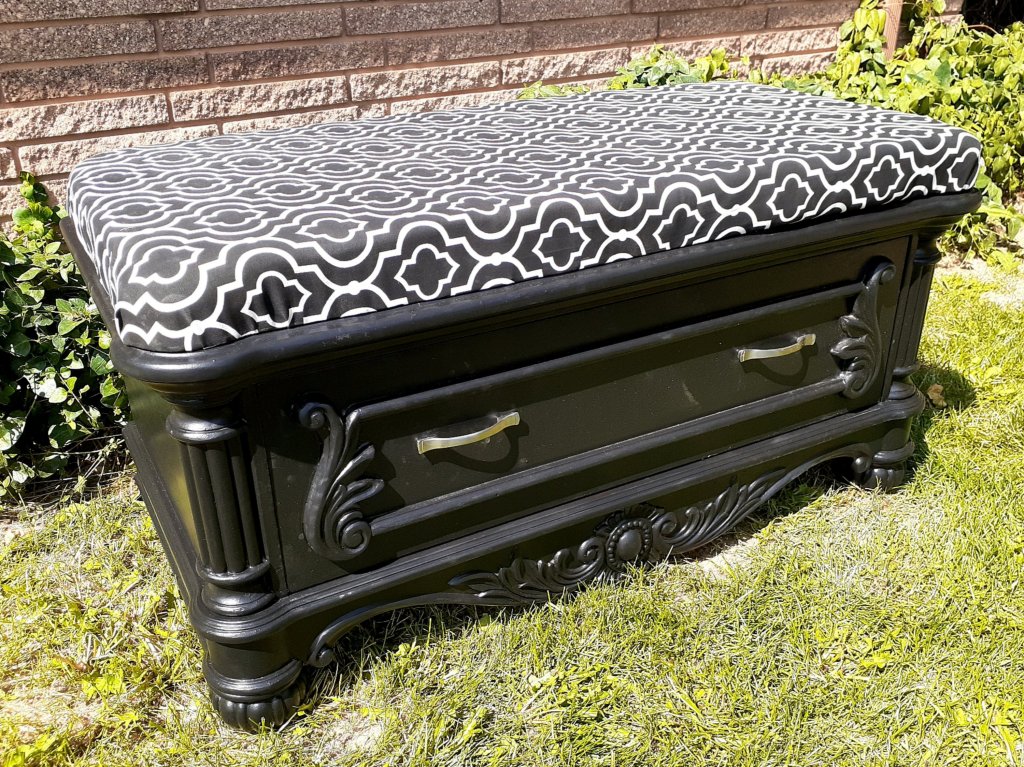 I love this fun little bench!I started with this little piece of furniture. I’m not sure what the original purpose was. Not a chest, not a dresser, not really a coffee table or console table. But it had a lot of fun details and was begging to be transformed into a bench!I started by cutting a 1/4th inch sheet of plywood to the size of the top using my jigsaw. I sanded the sides as best I could trying to get in all the crevices. I didnt worry about the top since it will be covered by the cushion. I removed the drawer front from the drawer itself to make sanding and painting easier.I love the feet and trim and all the pretty details!It was a pain trying to paint all the detailed areas that make this piece stand out.I painted the drawer front.I painted the sides but didnt worry about the top.I made the cushion using 3 inch foam. I traced around the plywood and the cut it out with scissors. I have one set of scissors I use exclusively for foam. The foam is so thick, it runs the scissors and makes it hard to cut anything else. I have to cut the foam in layers. I cut the top and the have to cut the bottom half separately because it’s too thick to cut through the whole 3 inch foam at once.I cut the fabric a few inches wider than the foam so it will wrap around.Once it’s all cut out, I layer my fabric face down, then the foam, and then the plywood. I start pulling the fabric tight and stapling the corners. Then I do the centers and work my way around until the fabric is tight and not lumpy.I attached the cushion using screws from underneath. I put the handles back on and I love how it turned out! I love the fun details and the bold fabric