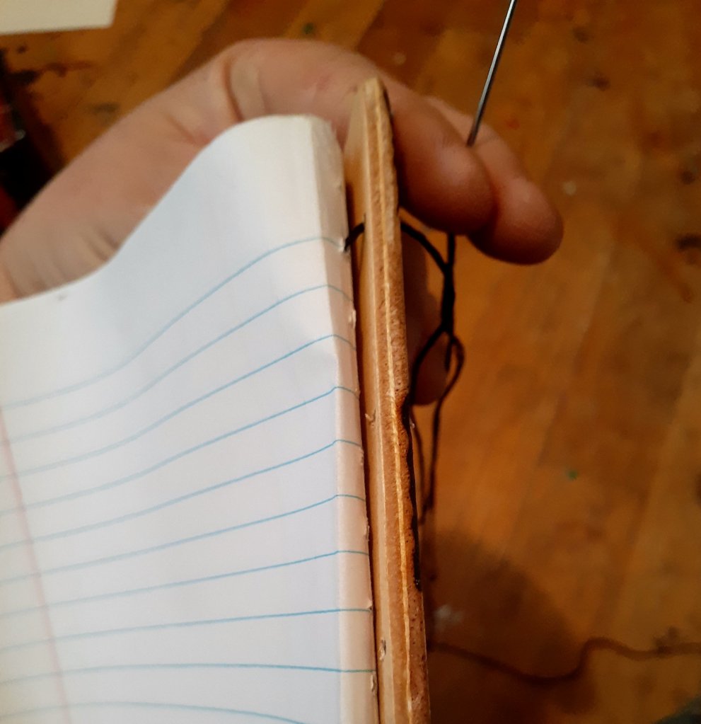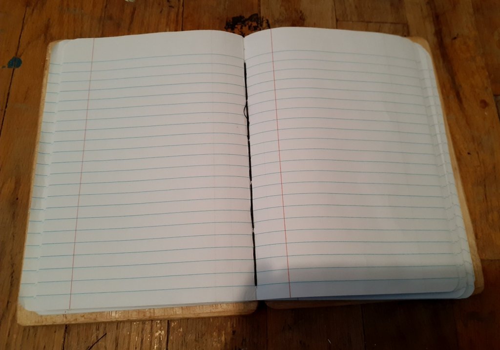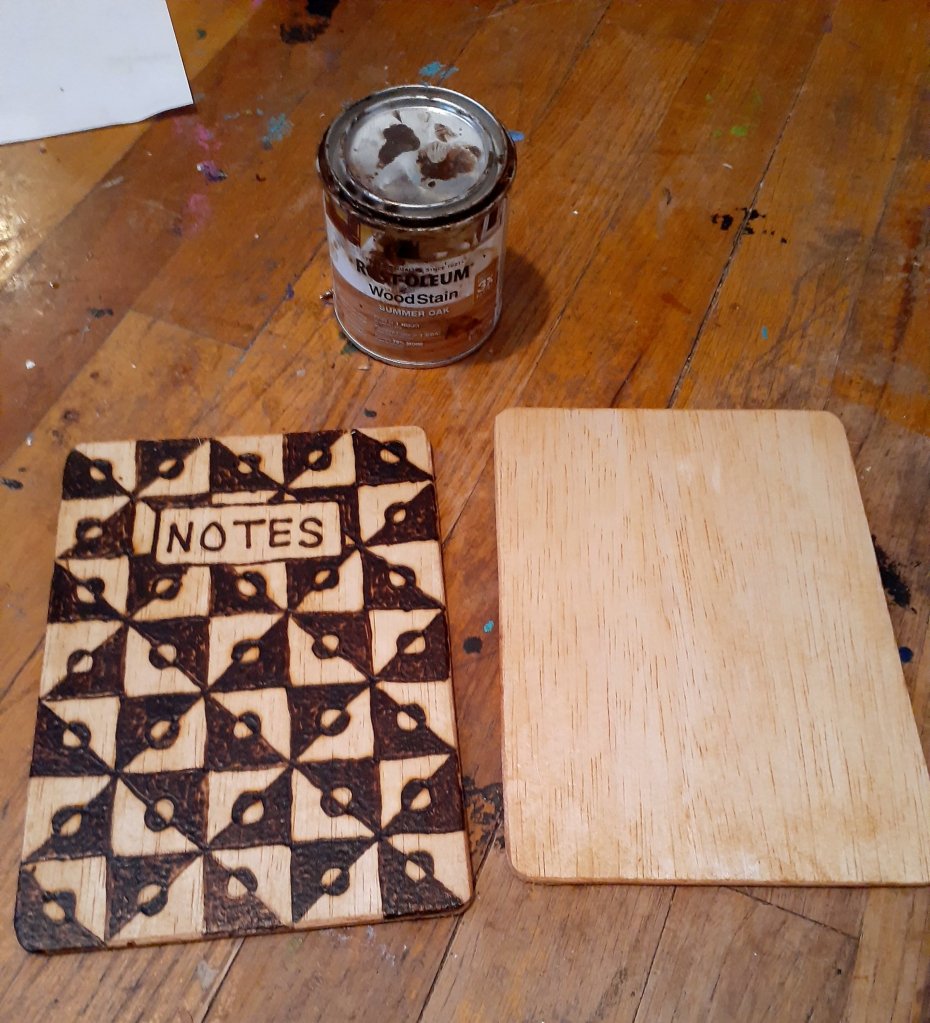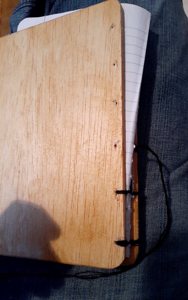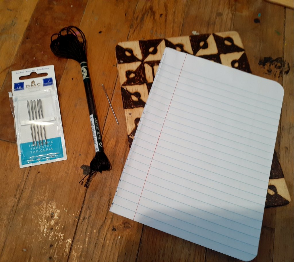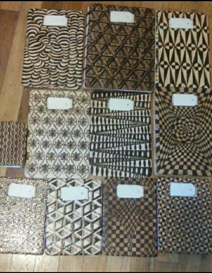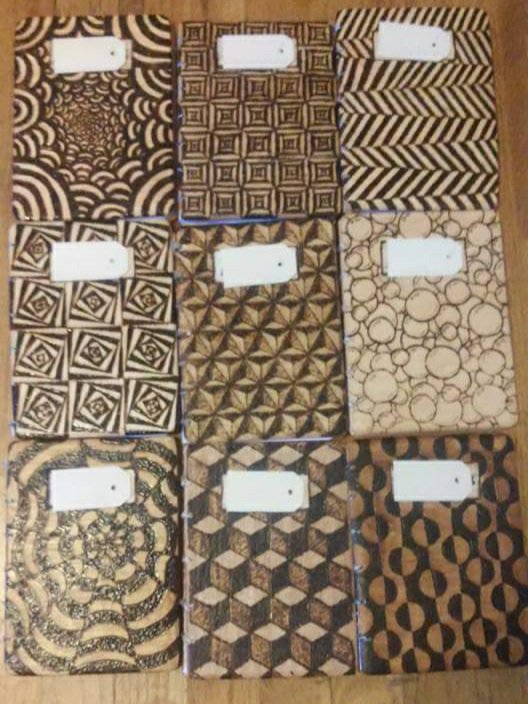 I had a lot of fun making these wood burned notebooks! I combined my love of OP Art and woodworking!This project is time consuming but it’s fairly cheap. I made a ton of notebooks and sketchbooks for Christmas gifts!I used 1/4 inch sanded plywood. You want to use plywood rather than underlayment so that the top wood layer will be thick enough. The easiest way to make lined notebooks is to start with a composition book. I bought 5×7 mini composition books for $.67 at walmart.You want to cut your plywood half an inch bigger than your paper. Since I used a 5″x7″ notebook, I cut my wood at 5.5″x7.5″. Then you want to sand it smooth. I like doing it on top of a piece of scrap wood so the bottom doesn’t get messed up.I sanded the front and back and rounded the sides. I also used my sanded to wound the corners.For the design, I search for op art or zentangles on pinterest. A lot of them have tutorials to show you how to draw it. I like to do a rough sketch before starting on the actual woodburning.I used a cheap $15 woodburning tool from Joanns and used a 50% off coupon. There are definitely more expensive fancier options out there, but this one worked for me. I strongly recommend using a piece of scrap wood the same kind as your covers and practicing woodburning. Get a feel for the different tips and how it works with your wood. My personal preference is the flow point.Lightly transfer your design to the board using a pencil. You can so whatever design you like. It doesnt have to be geometric patterns.I like to leave a clear rectangle to add a name or title. My cat likes to supervise.Begin woodburning. Be careful to hold the tool at a high enough angle that the round part of your tool doesn’t touch the wood and leave unwanted marks.Here’s my finished design! This took me about an hour.I stained front and back covers on both sides with Rustoleum Summer Oak. It gives the wood a richer feel while being light enough to not hide the design.To prepare the paper, take your composition book and carefully remove the coverCarefully remove the threadEvenly divide your papers into 5 stacks, with the shortest pages in the middle.As you can see, the center of the pages has multiple holes. I mark every 3rd hole to know where my thread will go.Line your paper up with the front cover. Mark every 3rd hole location so you will know where to drill.Mark holes on the back cover so it will match the front cover.Carefully drill holes in both covers.Here’s what you will need to Coptic stitch bind your book. You will want a long string. In my experience, it needs to be at least 7 times the length of your book. It’s better to have too much string than too little. Start with one stack of papers. Sew through the first hole.Sew through the front cover. wrap the string around the string between the cover and paper and then thread it back through the front cover and into the same hole in the paper.Tie a knot when you pull the string back to the middle of the pages and then sew through your next marked hole.Continue sewing through the marked holes and into the front cover. You can see me wrapping the string around the stitch and then back through the front cover and into the paper.Once you finish attaching the front cover, rather than going back into the original stack of papers, you need to attach the next stack.Insert your needle into the next set of pages.Continue following the same pattern, threading it through the holes. But rather than threading it through the front cover,wrap your string through the existing knotThe inside of the pages should look like this. You will sew through every 3rd hole, wrap it around the existing knot, then back through the same hole in the paper. Then sew through the next 3rd hole up.As you add each stack of pages, wrap the thread around the last knot.The back cover is kind of tricky. Finish attaching all 5 sets of paper. Then you are going to thread through the back cover, wrap it around the knot, and then go back into the last stack of pages again. Continue with each hole. When you get to the last hole, tie a knot in the center of the pages. For a better tutorial on binding, search Coptic binding on pinterest.This is mostly what your spine should look like. As you can see, on one hole I pulled too tight, ripping through a hole.Coptic stitch binding allows the notebook to lie flat.And here it is, done!